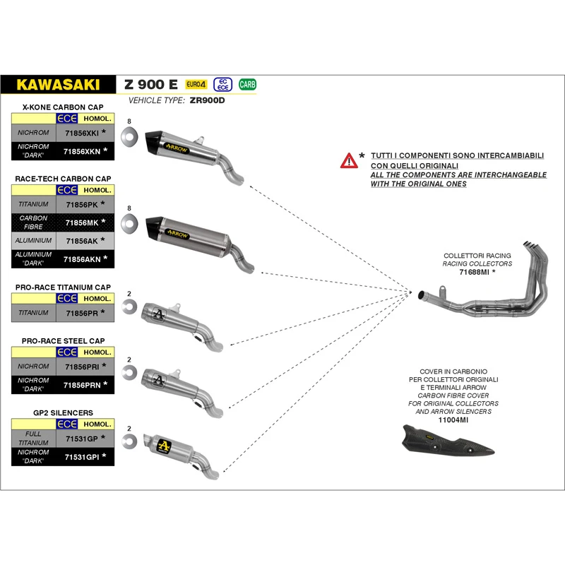 Collectors and pipes are a most important component of an exhaust system, making it possible to reach very important gains in terms of power and torque. Made in AISI 304 stainless steel and, for competition Full Titanium systems, in titanium, Arrow collectors design comes from the experience gained and the results achieved in years of races at all levels, with the un-replaceable “touch” of the master mechanics working in the R&D: diameters, sections, bends, section changes weldings and layout are carefully designed and developed on the bike to create a product with high performance, durable, reliable and with the unique Arrow style.