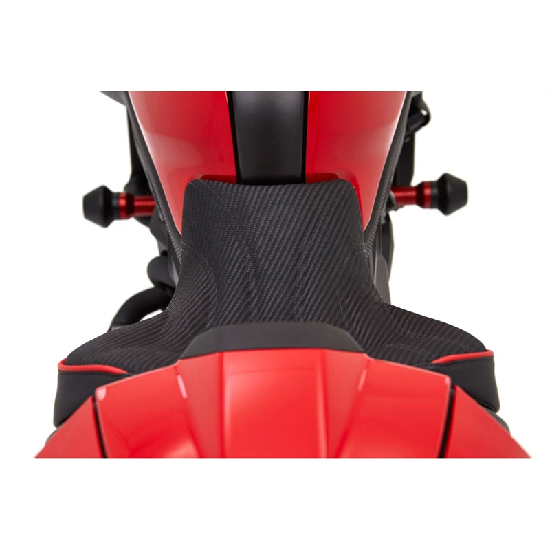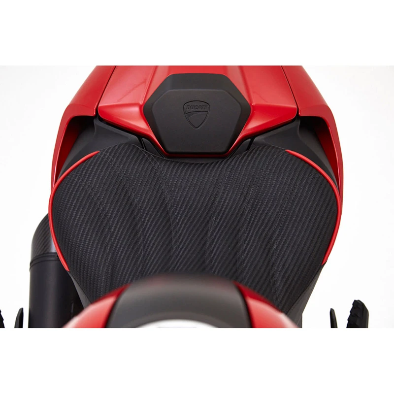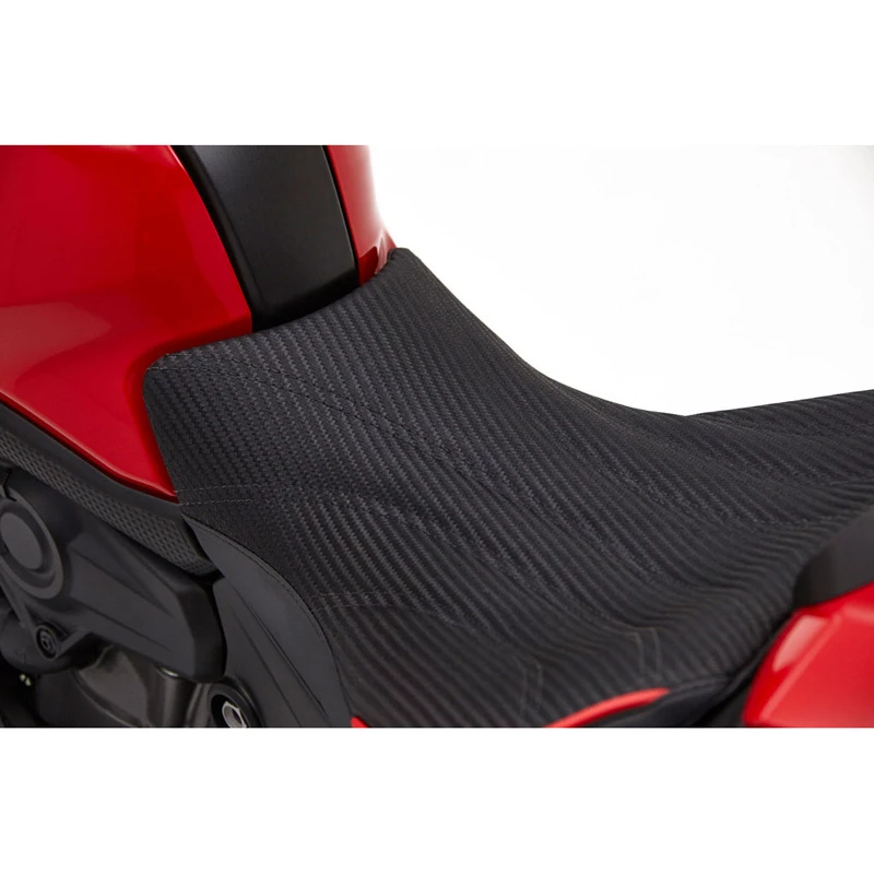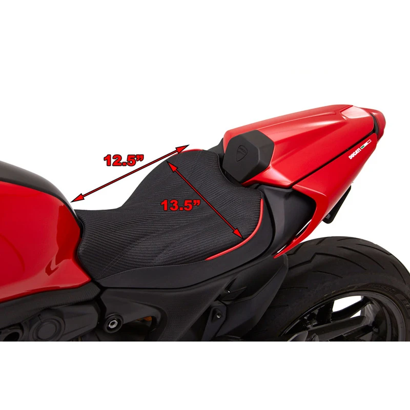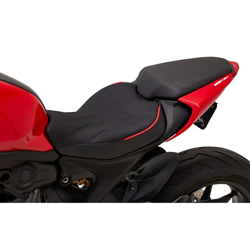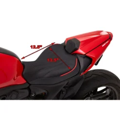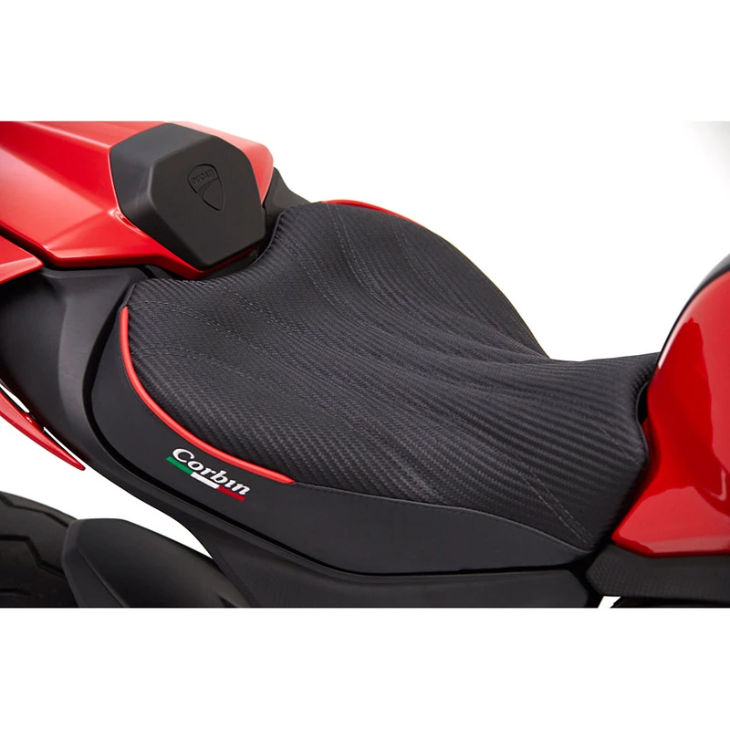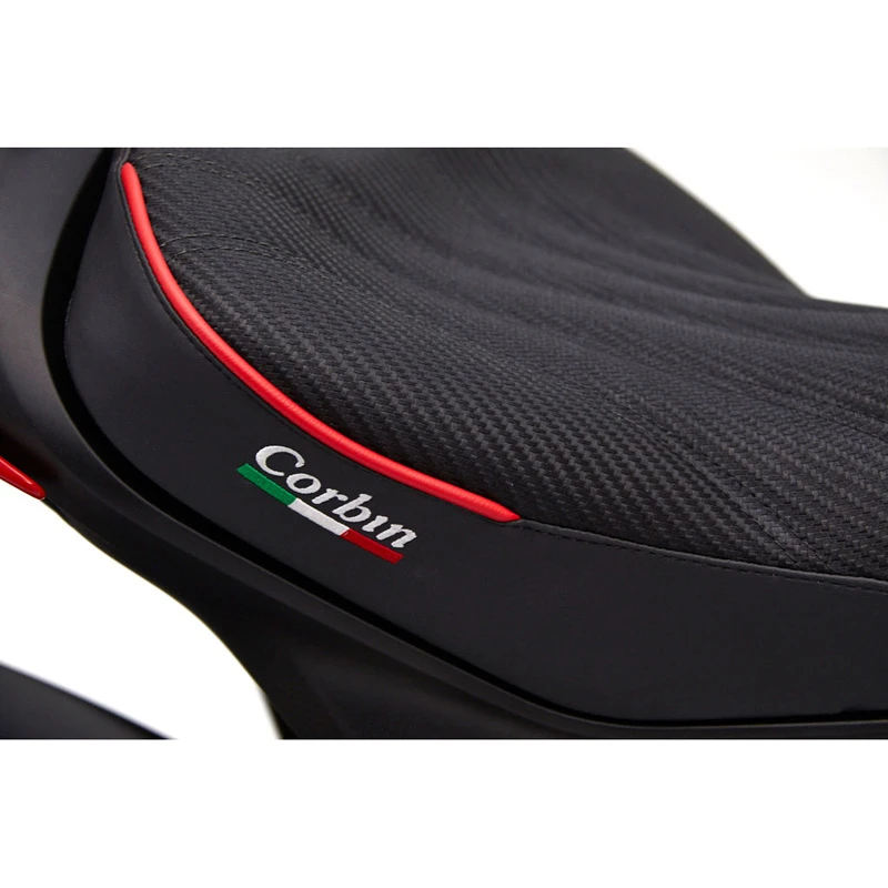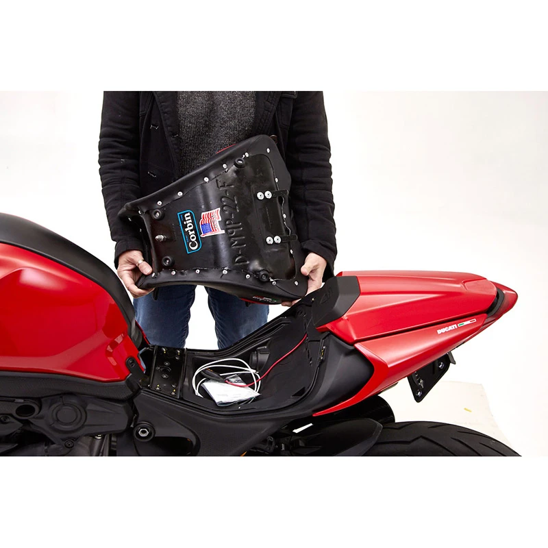- Corbin’s Fibertech basepan molds to every contour of the Ducati for a custom fit.