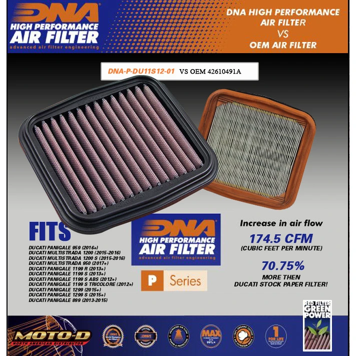 - The DNA filter has a 70.75% higher airflow than the Ducati stock paper filter!