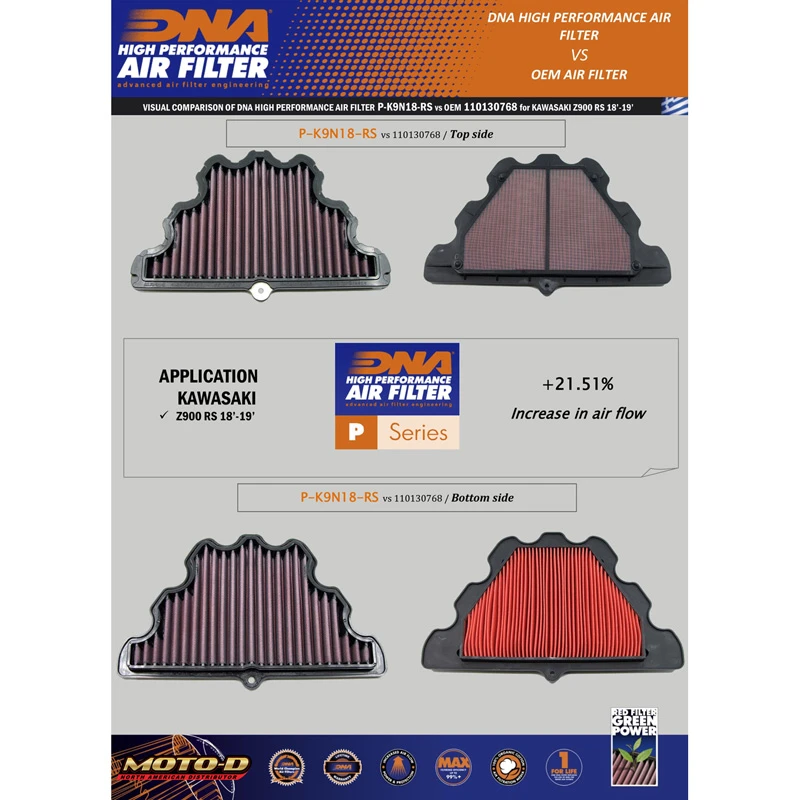 - The DNA filter has a 21.51% higher airflow than the Kawasaki stock paper filter!