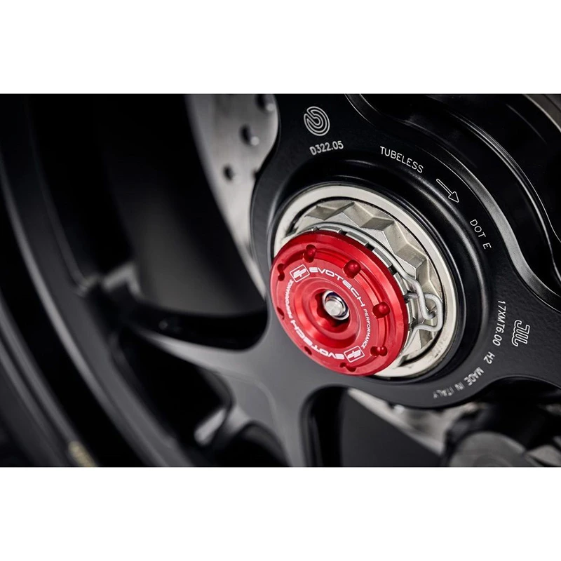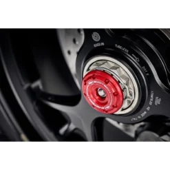 - Anodised red hub stop for the exhaust side