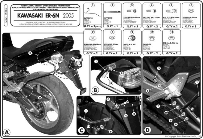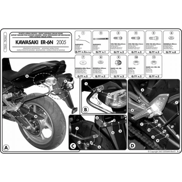 The GIVI T262 side holders for soft luggage on your Ninja 650R 2005 – 2008. This is a tubular rack that is powder coated black and comes as a pair. Allows you to utilize any of the Givi soft saddlebags on your motorcycle. This rack holds the saddle bags off your muffler and wheels. Provides you with firm attachment points. Installation instructions included.