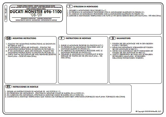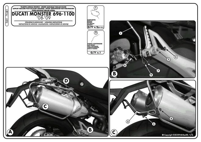 GIVI’s T681 Saddlebag Supports are made specifically for Ducati Monster 696 / 796 and 1100 (2008-2012). The T681 Pannier Holder is designed to take GIVI Saddle Bags. Please note that this GIVI Saddle bag Holder must be mounted either in conjunction with GIVI 780FZ Monorack Arms or the 7400 Kit below: