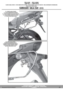 GIVI’s TE4107 Easylock Saddlebag Support is made specifically for Kawasaki Ninja 250R (2008-2013). The TE4107 Pannier Holder is designed to take GIVI Easylock Bags, it can also be used to take soft luggage side bags. This Pannier Holder must be mounted either in conjunction with GIVI 4107FZ Monorack Arms or the Kit below: