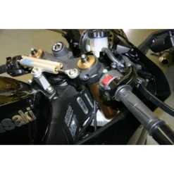 To gain the additional 1/4″ (7mm) rise on the 2006-2007 bike, you will need to replace the original steering damper bracket with a 2008 bracket that attaches to the top triple clamp. Kawasaki part number 11054-1903.