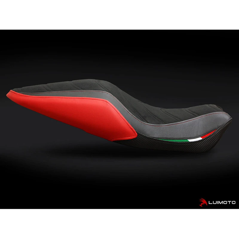 Maximize the style of your Ducati Monster 821 and 1200 with the Apex Edition seat cover. Featuring a newly developed stitching pattern; the Apex, which not only accentuates the Monsters lines, but is an evolution of the cafe racers traditionally ribbed seat. The luxurious synthetic suede top panel is wonderful and supple to touch, while the leather look, carbon fiber textured fabrics, contrast stitching and embroidered Italian flags all come together to compliment your fine machine. Stand out with the finishing touch of Luimoto.