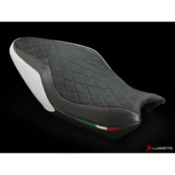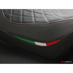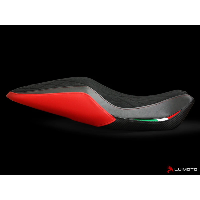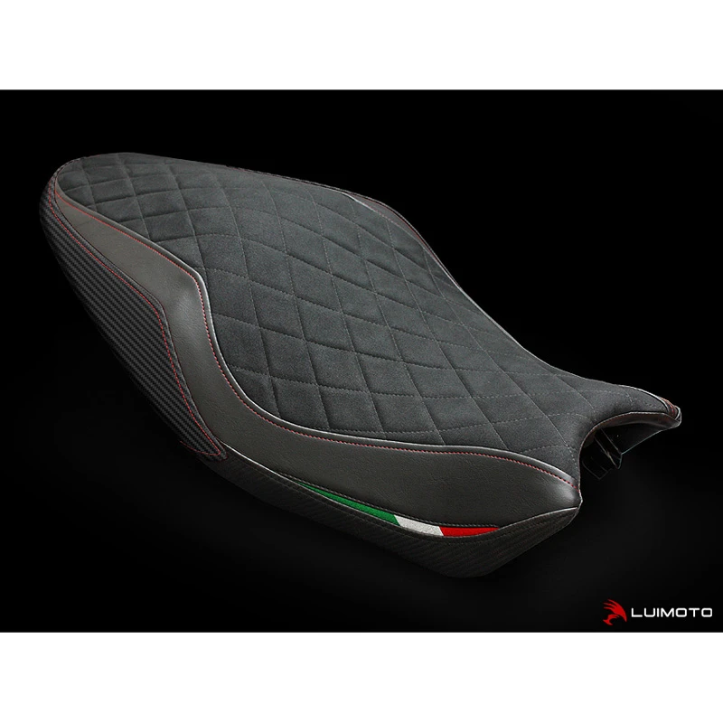 Maximize the style of your Ducati Monster 821 and 1200 with a Luimoto Diamond Edition seat cover. Featuring a luxurious synthetic suede top panel stitched in our famous Diamond pattern, leather look, carbon fiber textured fabrics and contrast stitching. All of this combined with Italian flags complete the look of your fine machine. Stand out with the finishing touch of Luimoto.