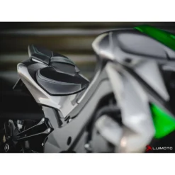 Maximize the style of your Z1000 with the Team Kawasaki Rider seat cover. This seat cover features carbon fiber textured fabrics with lime green stitching, and a dynamic swoop design to compliment the lines of your Ninja. Stand out with the finishing touch of Luimoto.