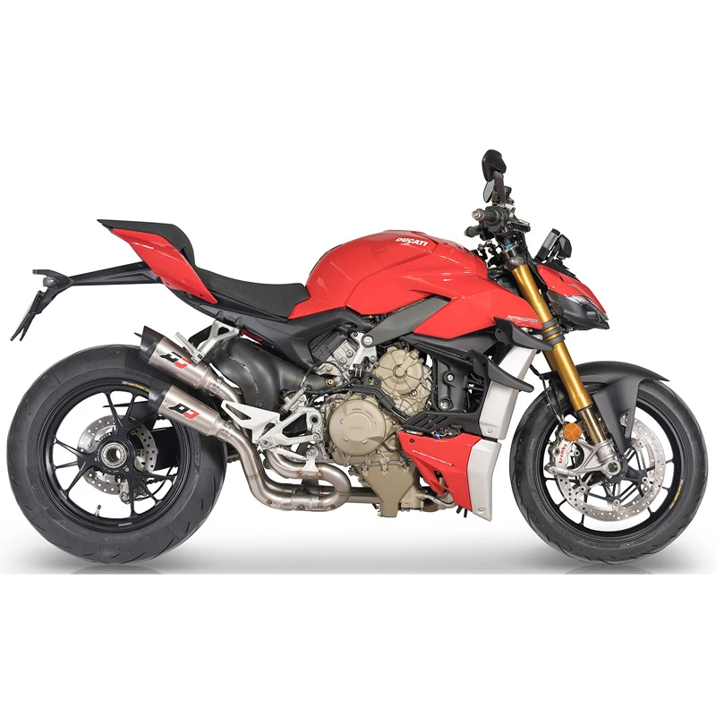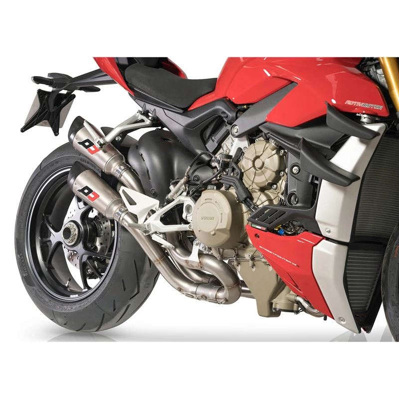 - In pure Superbike style the new 3/4 system for Ducati STREETFIGHTER V4. The system uses the first part of OEM headers, with a 2 in 2 layout, the diameters are 52mm with a H balancing pipe for the perfect flow in both engine banks. All the pipework is in stainless steel AISI 304 TIG Welded. The mufflers are the new titanium Gunshot with the thermo injected magnesium end-caps, the traditional signature from QD Exhaust. The rear footrests are still used. The power gain is awesome, +2/3HP all over the range, and 6HP at the top end.