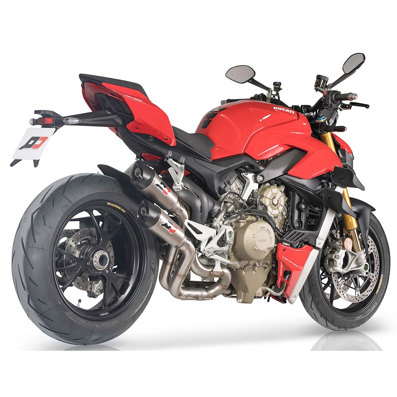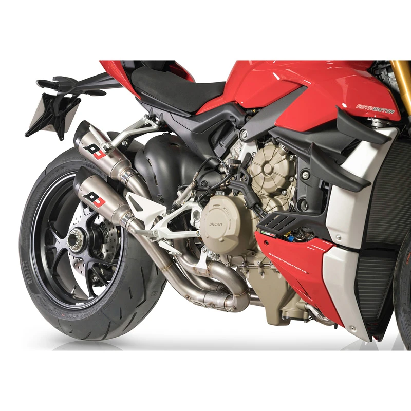 - In pure Superbike style the new 3/4 system for Ducati STREETFIGHTER V4. The system uses the first part of OEM headers, with a 2 in 2 layout, the diameters are 52mm with a H balancing pipe for the perfect flow in both engine banks. All the pipework is in stainless steel AISI 304 TIG Welded. The mufflers are the new titanium Gunshot with the thermo injected magnesium end-caps, the traditional signature from QD Exhaust. The rear footrests are still used. The power gain is awesome, +2/3HP all over the range, and 6HP at the top end.
