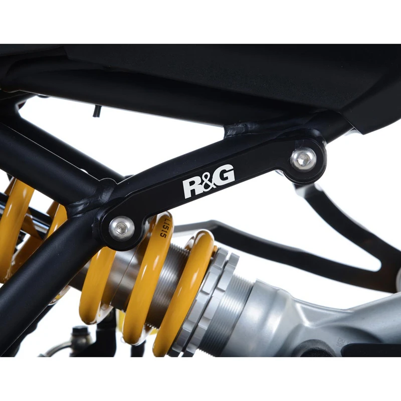 Remove the unused left hand side rear footrest pillion hanger and clean up the looks of your motorcycle with the R&G rear foot rest blanking plate. Manufactured using CNC machined aluminum and anodized black with a white printed R&G logo these blanking plates are perfect for your Ducati. Over time dirt and debris can clog holes left in your sub-frame causing corrosion. Easily prevent this by using the R&G rear footrest blanking plate.