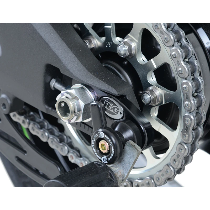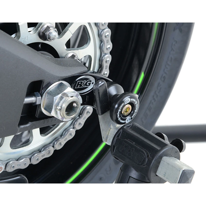 R&G’s CR0054BK Offset “Cotton Reel” Rear Axle Sliders are made specifically for Kawasaki ZX-10R Ninja (2016-current) & ZH2 (2020-current).