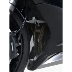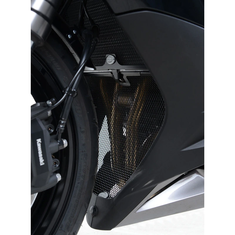 This R&G exhaust header pipe grill is manufactured out of aluminum and is constructed to fit your motorcycle perfectly. By installing this grill you are protecting those vulnerable (and expensive to repair) exhaust headers and integral components below the radiator from damage causing flying debris. This downpipe grille is available in a black or green powder coated finish that further enhances the durability of the guard while also adding a more aggressive look to your Ninja 1000.