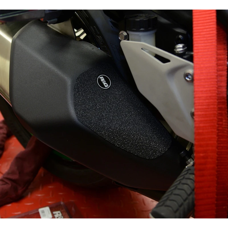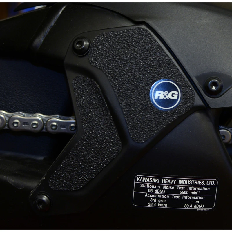 The R&G boot guard kit for the Ninja H2 SX protects the swingarm and exhaust heat shield from scratches and scrapes. Low profile synthetic rubber pads add minimal thickness and are precision cut to match the design and shape of the factory equipment. These handy boot guards enhance grip with a unique texture that is gentle enough that you won’t ruin expensive riding gear.